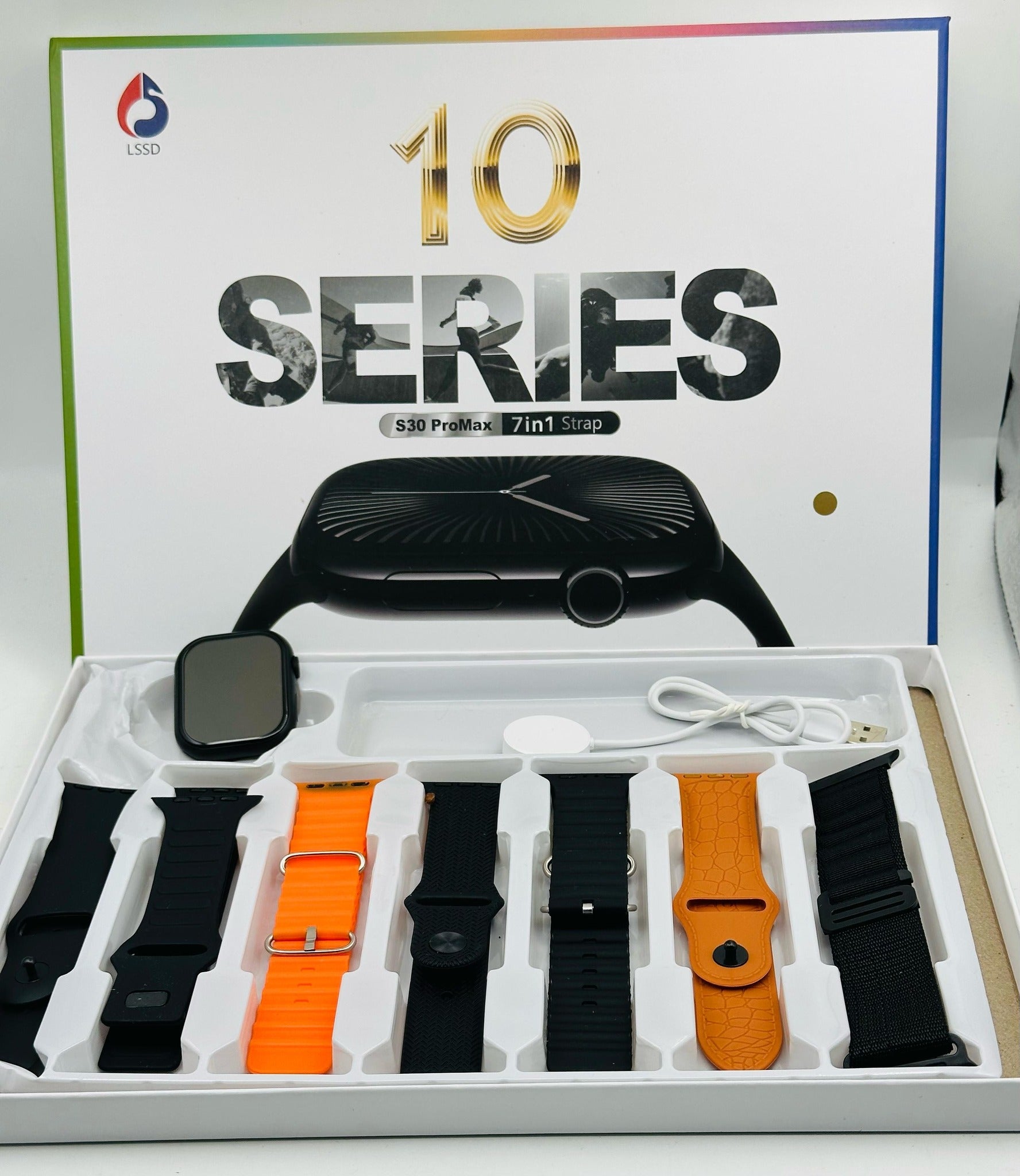 In the box, you will find the 10 Series Smartwatch, a magnetic charging cable, a user manual, and a warranty card (if provided).